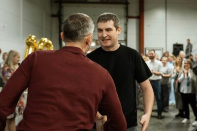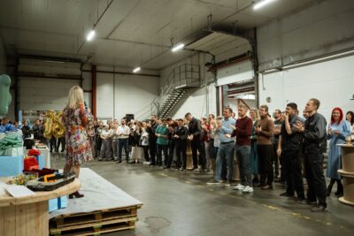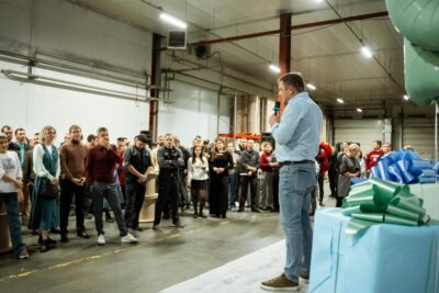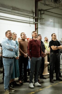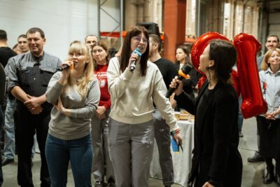 В честь праздничного события провели традиционное общезаводское утреннее собрание. Ночная смена заканчивает работу, дневная принимается за дело — и есть возможность ненадолго собраться всем вместе.